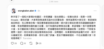 O deputado Wong Ka Lon respondeu a algumas perguntas na rede social threads e afirmou que não representa os residentes de Macau. A resposta foi escrita, depois de ter sido confrontado com o facto de ser um deputado nomeado pelo Chefe do Executivo.