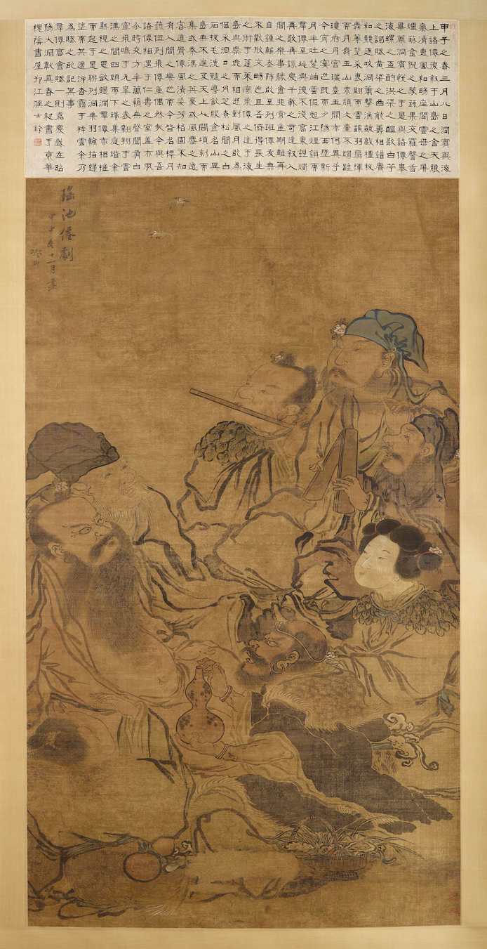 Via do MeioA Exemplar He Xiangu Que Concilia a Humanidade Paulo Maia e Carmo - 20 Abr 2026 Wu Zetian (625-705), que de humilde concubina do imperador Taizong (r. 626-649) se tornaria, depois de casar com o seguinte imperador, na única mulher de facto imperatriz, procurou instituir mutações nas mais variadas áreas do seu poder. A começar pela alteração da grafia do caracter do seu nome próprio Zhao, que significa «brilhar» para passar a significar «o sol e a lua no céu iluminam tudo». Desse olhar desperto, atento a tudo sob o céu, terá surgido a lenda que fala do seu descobrimento de que algures no império, em Zhengcheng (Guangdong), existia uma jovem chamada He Qiong, um nome que se pode traduzir com «tal como o jade fino», que conhecia os segredos da imortalidade através de uma dieta de mica e raios de luar. Sendo algo que sabia não ser capaz de alcançar sozinha, chamou-a à corte. E ela veio, só que a meio do caminho percebendo a imoralidade da desmedida ambição de poder da imperatriz e perante o assombro dos atónitos membros do séquito que a trazia, elevou-se no ar em pleno dia e desapareceu entre as nuvens. Essa jovem, mais tarde conhecida como He Xiangu, «a imortal donzela» era, também ela, a única mulher de um grupo de «oito imortais», baxian, que nessa dinastia Tang (618-907) se ia consolidando em exemplos de seres de edificante cáracter que influíam nas forças do além e a quem se podia recorrer para alcançar os bens de uma vida plena como a prosperidade ou a longevidade. Acarinhadas personagens do folclore, foram amiúde figuradas nos mais diversos suportes artísticos ou decorativos. Um pintor da dinastia Ming que usou o método da «escola Ma-Xia» de figurar pessoas com origem no estilo dos pintores Ma Yuan e Xia Gui da dinastia Song, representou-os de modo inesperadamente próximos uns dos outros num rolo vertical exaltando a clareza que se deduz da alegria, igual para todos em todo o lado. Zhang Chong (1593-1665), nesse rolo de 1644, Reunião dos imortais em Yaochi (tinta e cor sobre seda,171,8 x 36,4 cm, no Museu Britânico), refere o salgado «Lago de jaspe» nas montanhas Kunlun na Província Qinghai, conhecido como Heihai, o «Mar negro», a morada de Xi Wangmu, a «Rainha-mãe do Oeste». É aí que os imortais vão celebrar o seu aniversário, renovando a imortalidade ao comer uns inefáveis pêssegos. Estando tão próximos uns dos outros, o pintor também aproxima do observador as personagens que fazem o trânsito para a eternidade. He Xiangu fá-lo especialmente sendo primeiro uma devota cuidadora dos pais e depois, como imortal, resolvendo dificuldades, ajudando os que estão em perigo. E se face a Wu Zetian ela representa um dinamismo oposto ao excesso egoísta de poder pessoal, no grupo dos imortais ela fornece o yin que equilibra o excesso de yang de Lu Dongbin, o líder informal dos oito. Na pintura, face aos outros, a sua única face branca brilha, iluminando os outros.